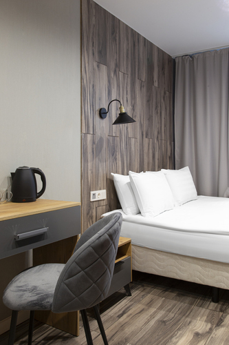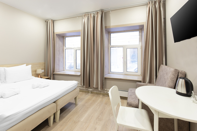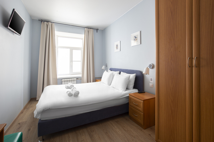 Номер выполнен в светлых тонах, предназначен для проживания одного или двух человек. Номер оснащен всем необходимым для комфортного проживания: удобная двуспальная кровать 160*200 или две односпальные кровати 80*200 с ортопедическим матрасом, рабочая зона, wi-fi, плазменный ТВ, место для хранения вещей.