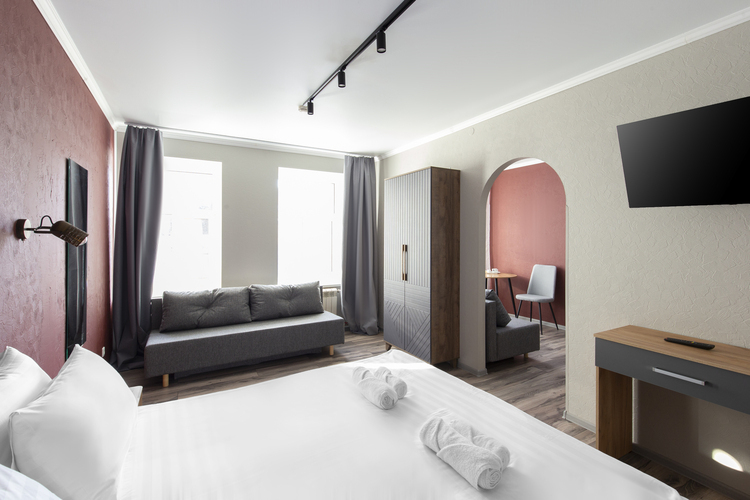 Есть возможность установить дополнительную односпальную кровать 80*200 и детскую кроватку. Номер оснащен всем необходимым для комфортного проживания: рабочая зона, wi-fi, плазменный ТВ, место для хранения вещей, гладильные принадлежности.
