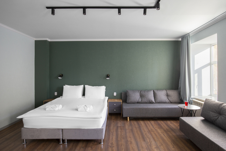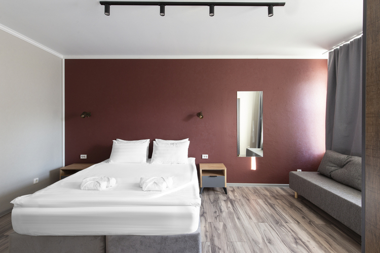 Номер выполнен в светлых тонах, идеально подходит для проживания семьи с детьми. Номер с двуспальной кроватью 160*200 или две односпальные кровати 80*200 с ортопедическим матрасом.
