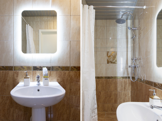 В ванной комнате: душ, тапочки, фен, полотенца, средства личной гигиены.